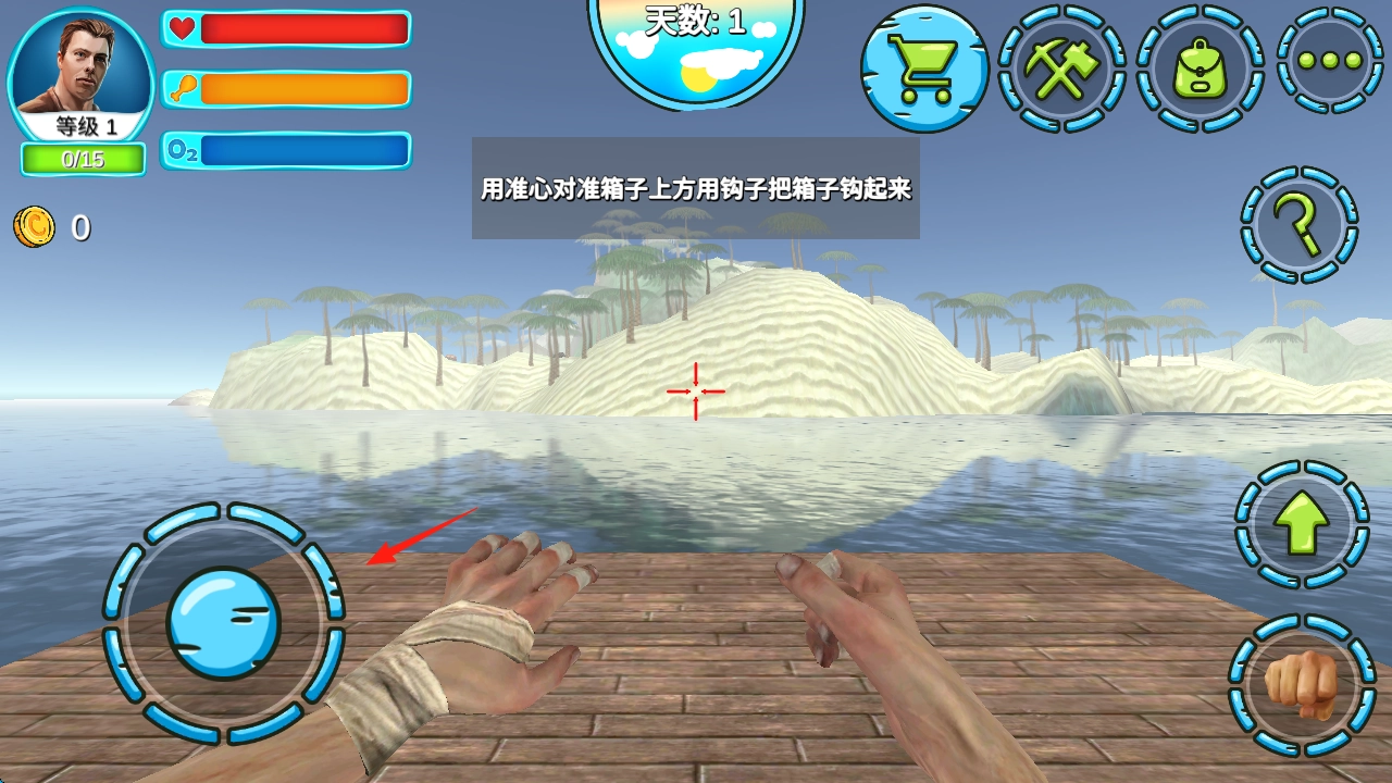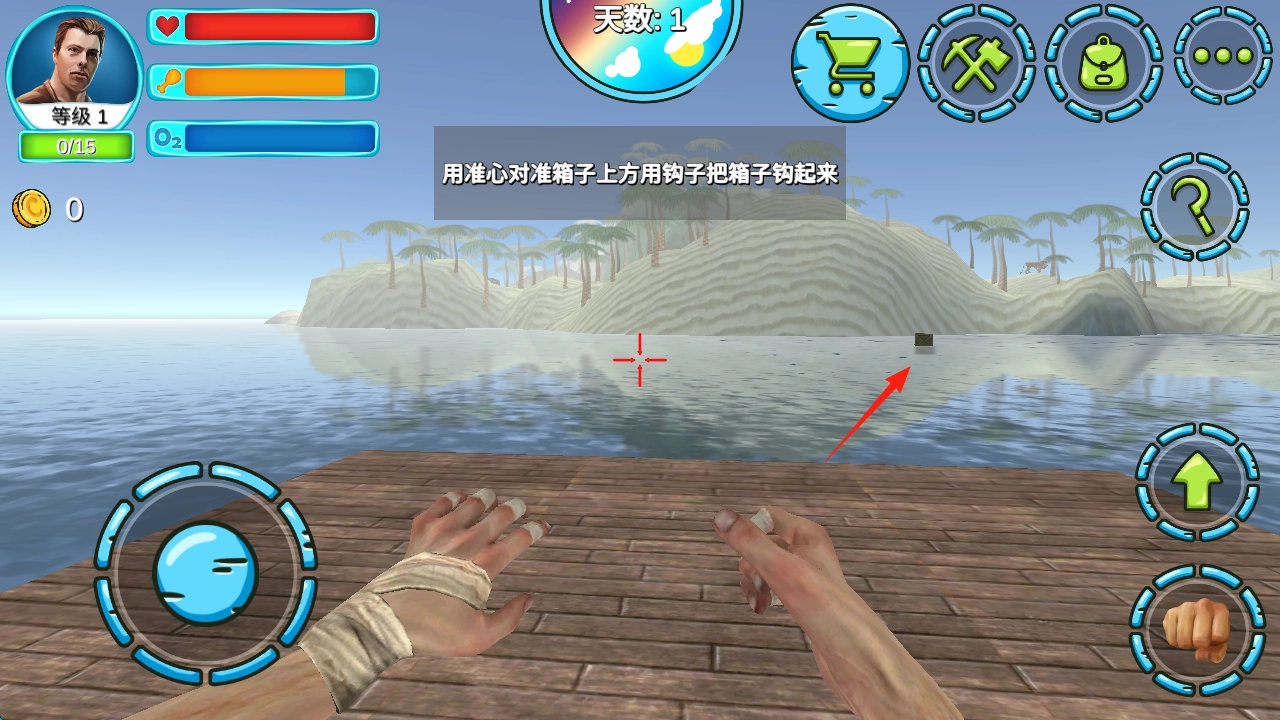 按照红箭头的提示,用准心对准箱子,点击钩子按钮来钩取资源,收集箱子里的材料,以此提升生存能力。