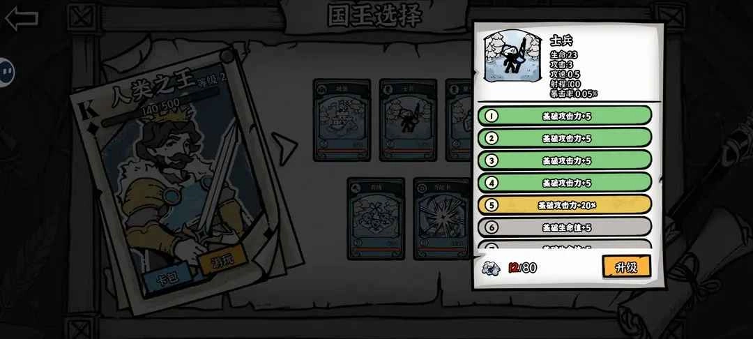 6.卡牌升级 获取碎片,进行升级。升级时点击国王进入,第5级升级时提升较大