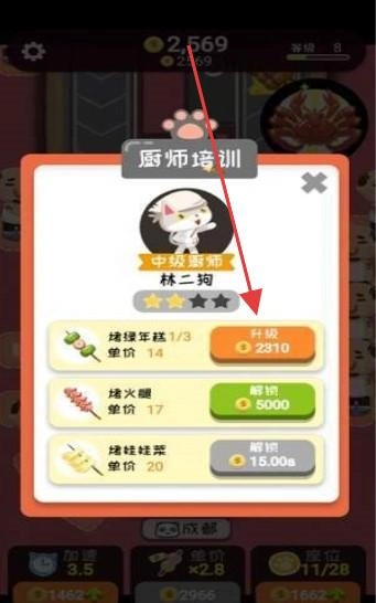 进入厨师培训界面后,可消耗金币等资源,为林二狗这类厨师提升技能等级、解锁全新菜品,以此增强餐厅的整体实力。