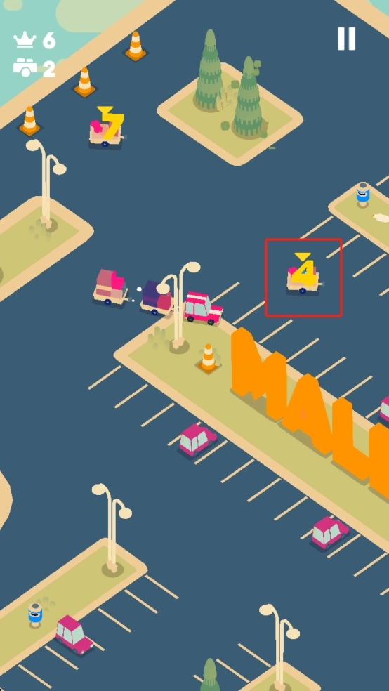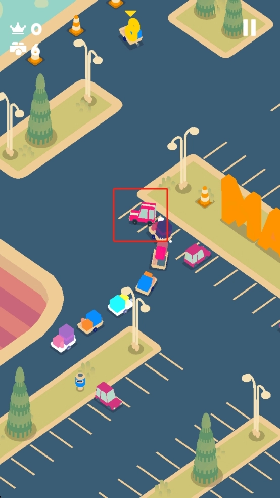 在道路场景里,我们要操控那辆红色小车,得精准地和同色车辆连接组成车队,行驶过程中还要避开其他颜色的车辆以及路障。