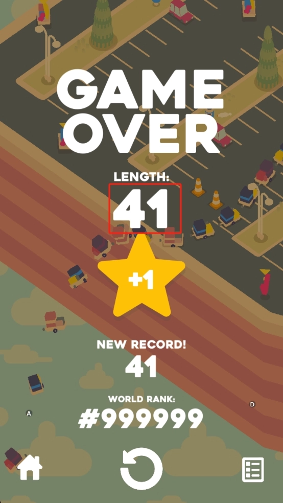 游戏结束后,界面显示“GAME OVER”,本次行驶距离为41,获得1星奖励,新纪录已同步更新,您可以点击重新开始按钮继续挑战。