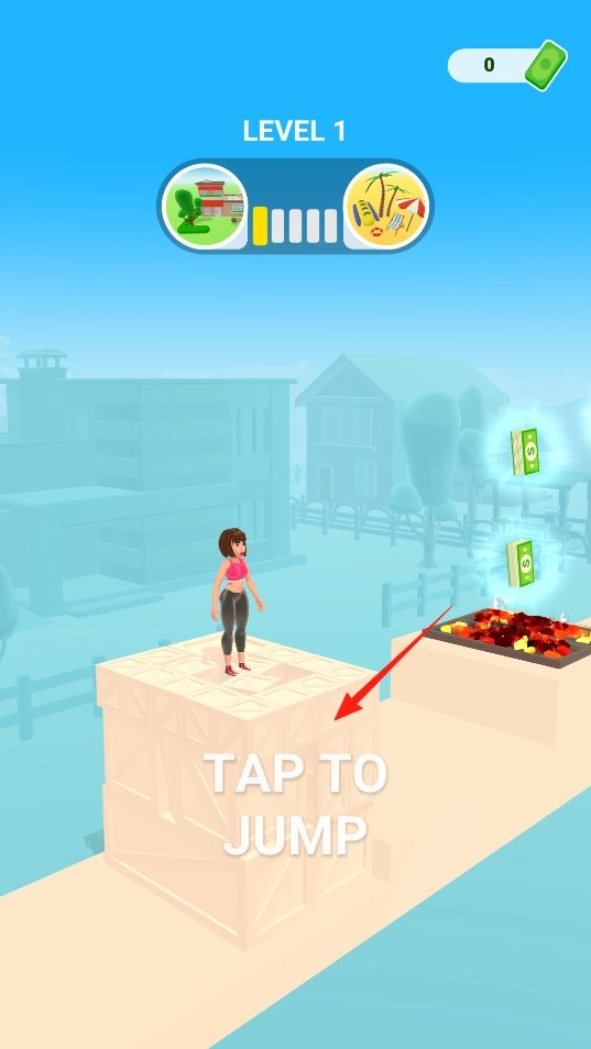 在关卡的起点位置,点击“TAP TO JUMP”按钮,角色就会向上跃起,一路越过各种障碍,同时收集路上的钱币,开启这场跑酷挑战,亲身感受跳跃启动的机制。