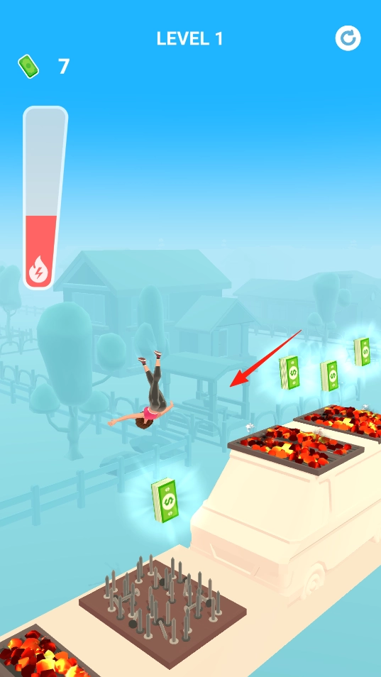 角色跃起后在空中翻转,要避开途中的尖刺、火焰等障碍,还要收集漂浮的钱币,通过操作来控制角色的落点,感受障碍躲避的玩法。
