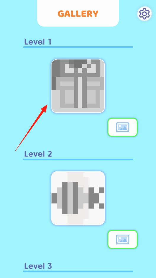点击Level1的像素图案,进入对应的关卡。在关卡中,按照规则完成像素填充,解锁完整图像,体验关卡选择机制。