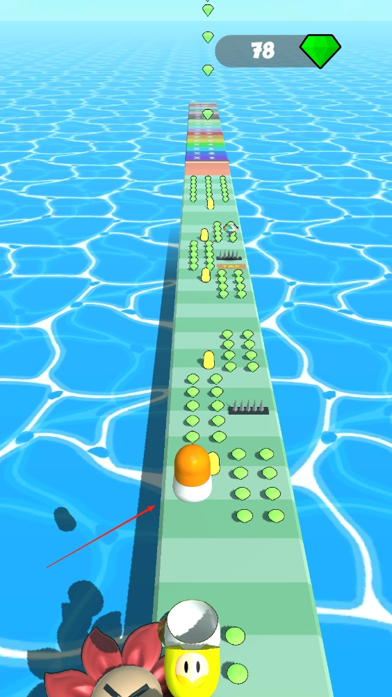 小豆豆往前跑,我们得控制它去收集小钻石和外壳,收集的数量越多,外壳就会变得越厚实,它也就越难被障碍物撞倒。