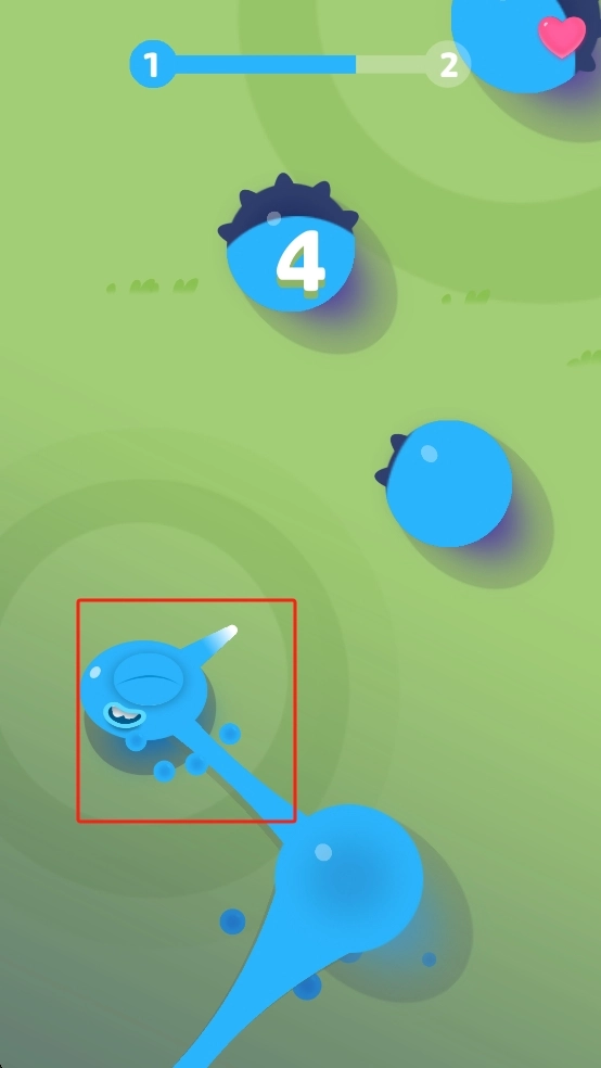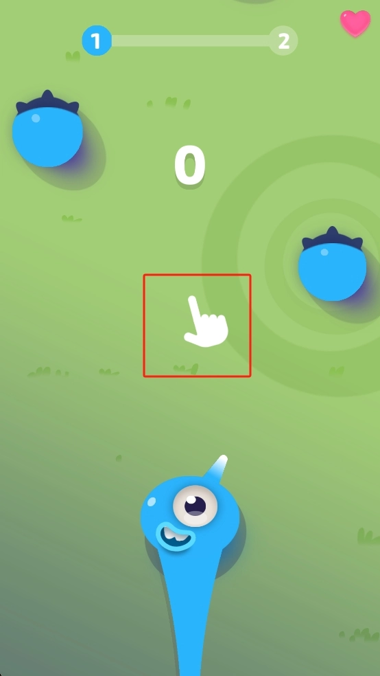 按照屏幕上的指引进行点击操作,操控蓝色怪物在草地上移动,对准没有尖刺的蓝色圆球,通过触碰的方式将其吞噬来积累分数。