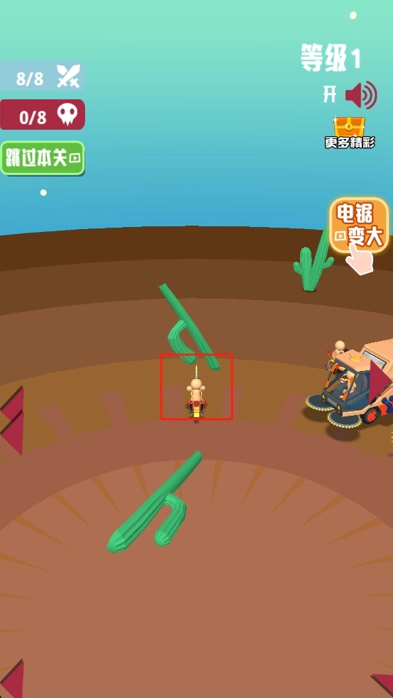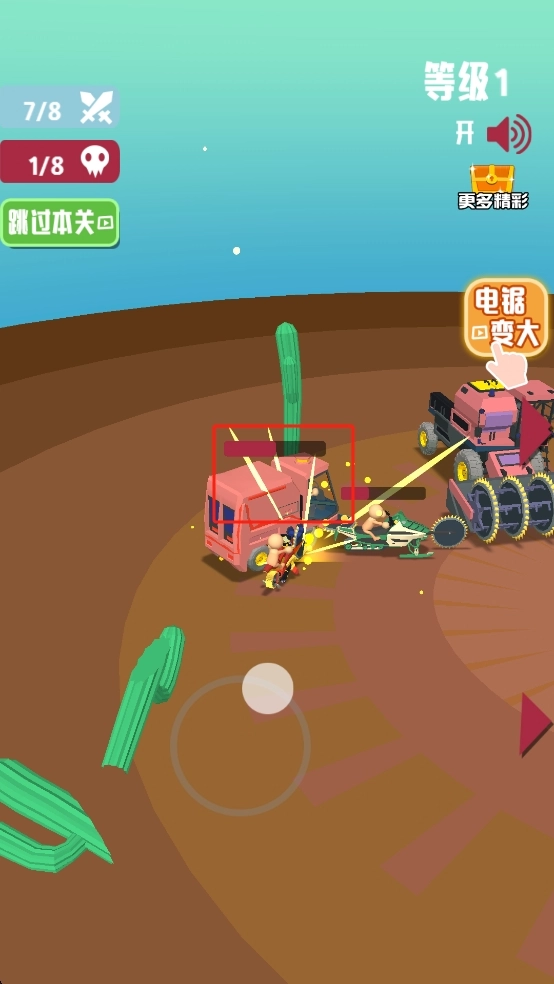 操控摩托角色在沙漠场景中行动,留意周围的仙人掌障碍,通过击杀敌人让自身不断变大,进而向敌方单位发起进攻。