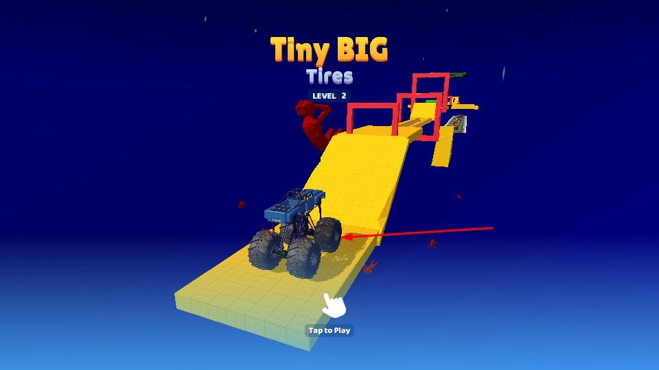点击界面底部的交互提示,操控蓝色越野车从黄色斜坡出发,即可正式开启Level 2关卡的挑战。