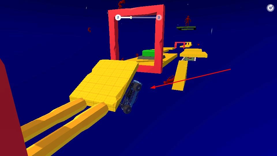驾驶越野车驰骋于黄色赛道,穿越红色框架式障碍,灵活操控车辆避免翻车,稳稳地向终点推进。
