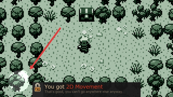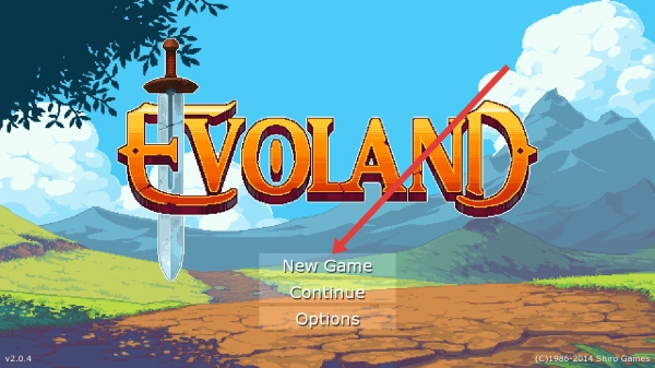 请按照指示点击主界面的New-Game选项,以此开启Evoland的冒险之旅,随后进入初始的2D地图场景。