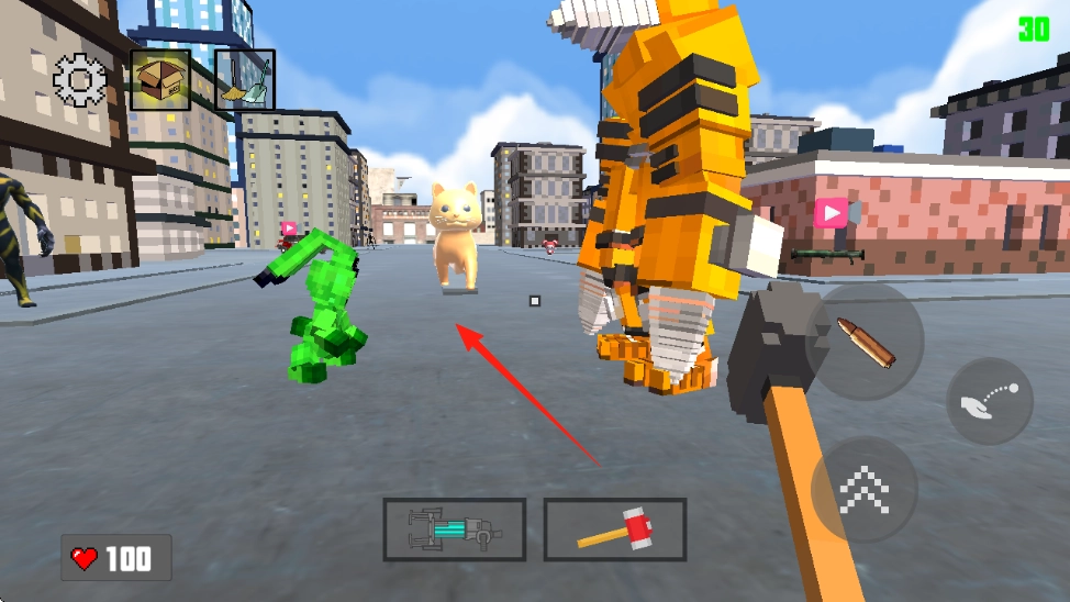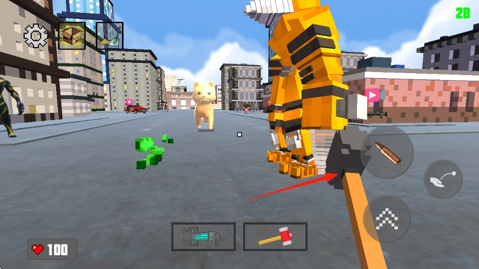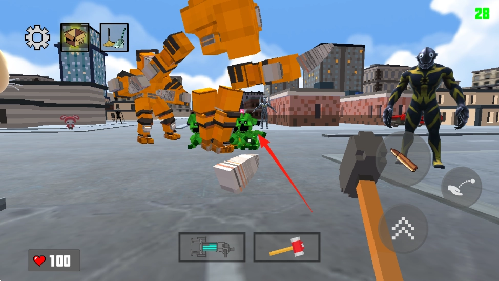 以第一视角操控角色,在城市街道的场景中,使用锤子武器攻击绿色生物、黄色机器人等敌人。