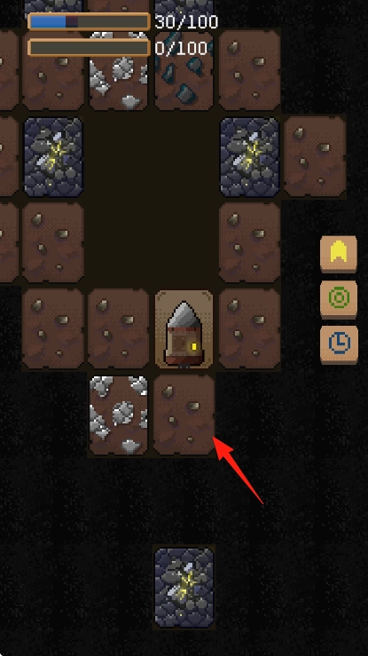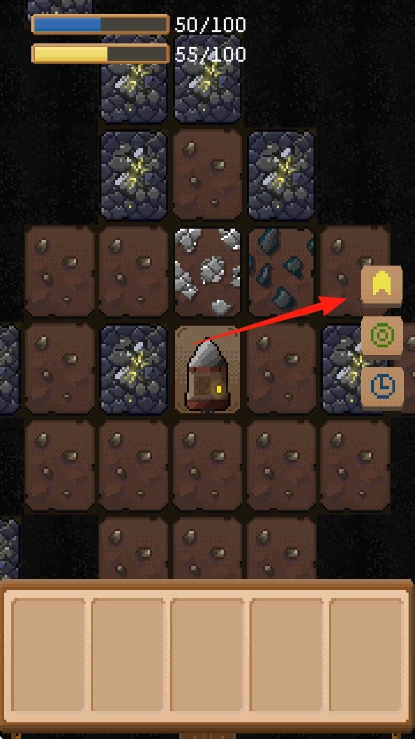 角色在挖掘过程中,点击右侧的功能按钮,借助对应的道具,能够辅助挖矿机进行移动、探测或者加快挖掘速度。