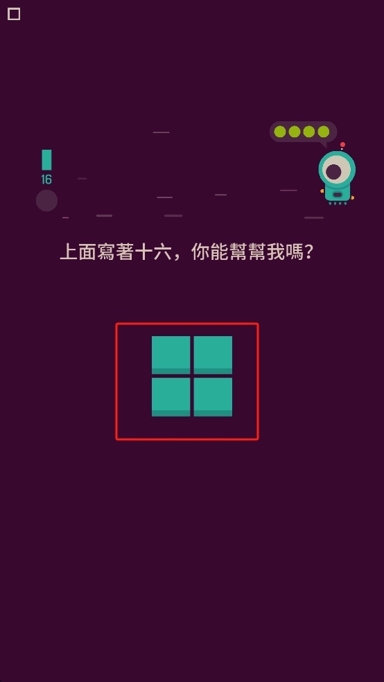 看到上面显示着十六的提示,留意左侧的数值16,点击下方的四个青色方块,试着进行组合或移动操作,使它们和16产生关联。