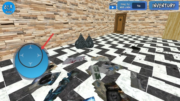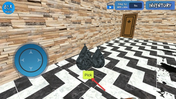 在移动时,点击Pick按钮来拾取物品,把垃圾收集到背包里,对房子进行修整。