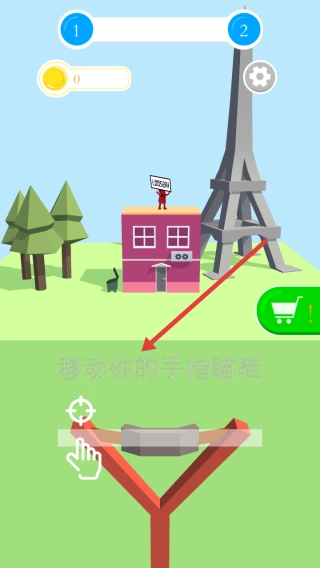 进入游戏后,用手指拖动弹弓来调整瞄准角度,对准屋顶上举着牌子的目标,松开手指就能发射弹丸,试着精准击中它。