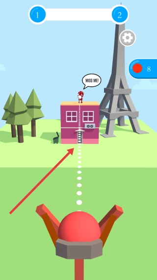 发射后留意弹丸的飞行轨迹,要是没击中目标,就借助剩余次数界面显示的数字8来调整瞄准角度,同时还要依据目标的移动情况和躲避节奏进行相应的调整。
