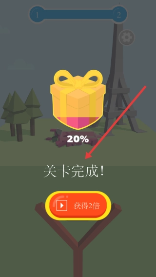 成功击中目标后,稍作等待进行结算,待关卡完成的提示出现,你可以选择获取2倍的翻倍奖励,然后继续挑战接下来的关卡。