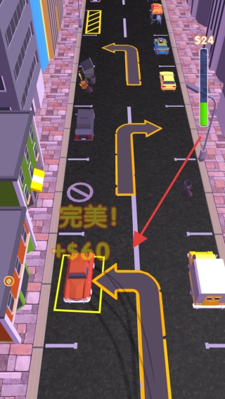 提前规划好行驶路线,借助箭头转向的提示,控制好车速,把车辆安全停入车位放在首位,持续积累金币来解锁新的关卡。