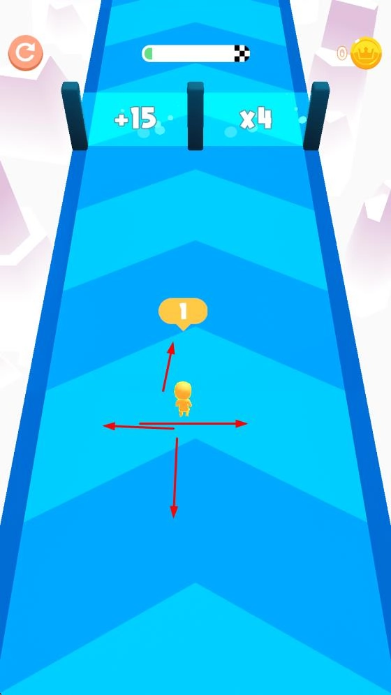 引导小人前往增益区域,借助增益效果快速增加数量,朝着前方目标高效推进,加快游戏进度。