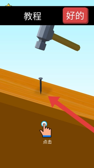 现在处于教程页面,新手玩家可以先跟随教程进行游戏,当遇到钉子时需要立即点击锤子。