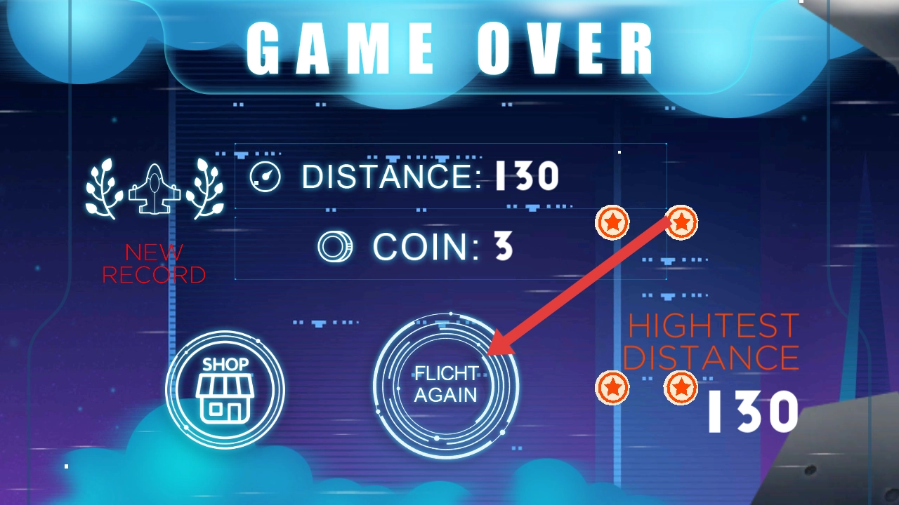 碰到障碍物导致游戏结束后,点击“FLIGHT AGAIN”按钮即可重新开启挑战,试着打破更远的飞行距离纪录。