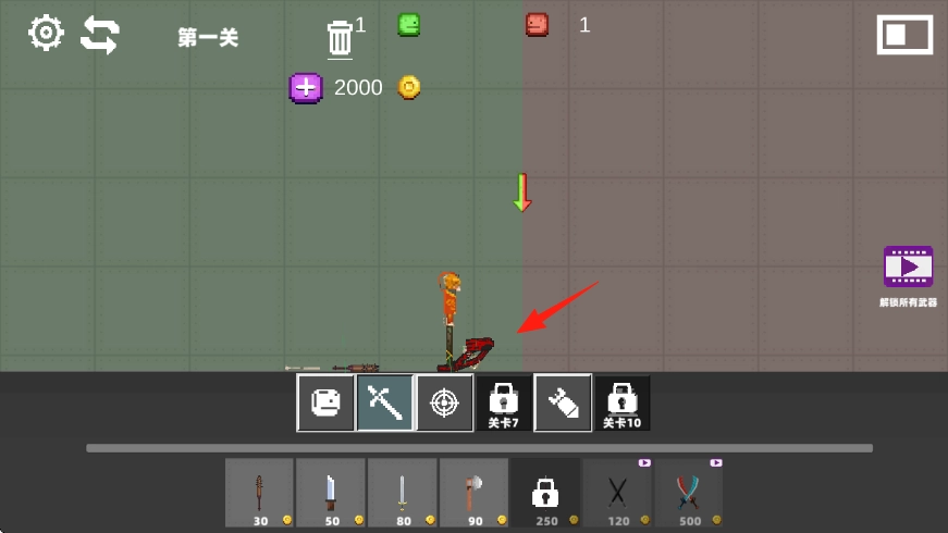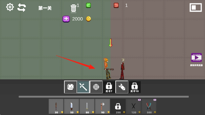 在主界面选择关卡模式,进入第一关后,操控橙色角色,并在下方选择武器。
