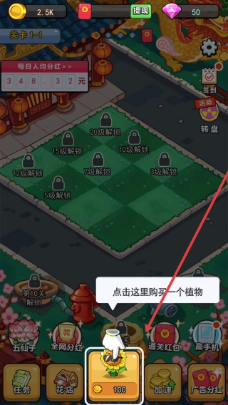 在关卡1-1的界面里,能按照游玩提示,消耗100金币点击购买向日葵植物,以此为抵御敌人准备好基础战力。