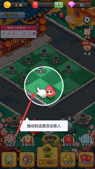 按照提示将Lv.2草莓植物拖拽至草地的指定位置,布置妥当后就能对来袭的敌人发起攻击,以此推进关卡的防御部署。