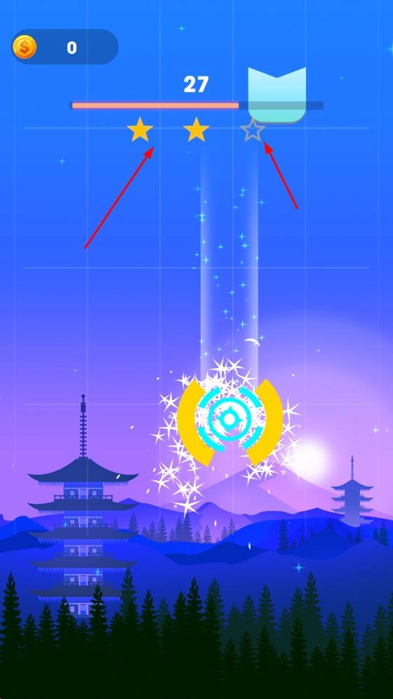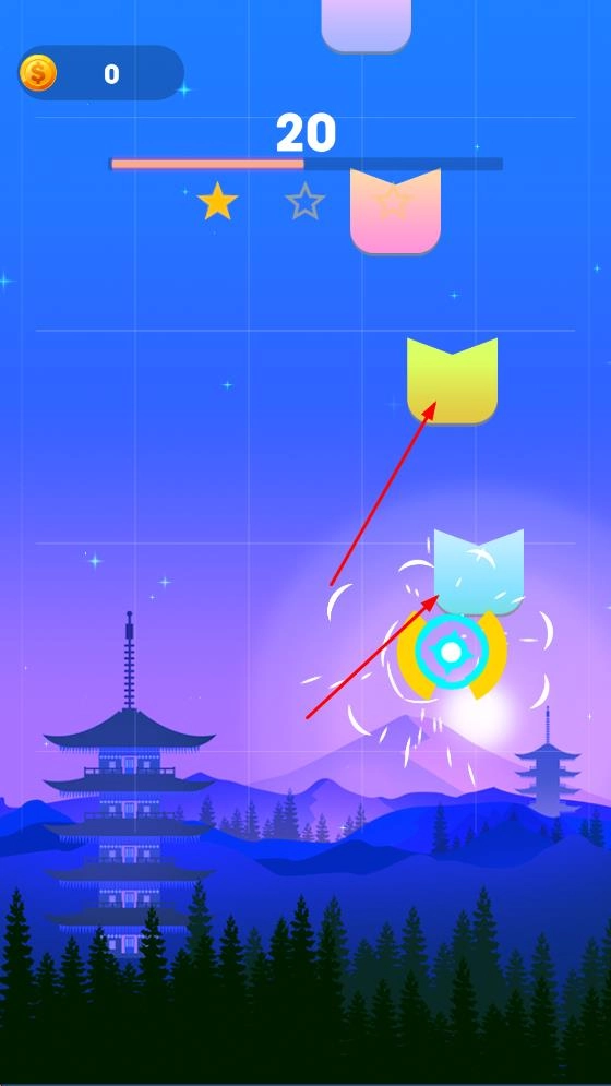 在蓝绿渐变色的场景里,操控黄色环形角色去撞击上方各色图标,既能获取分数,又能积累星星评分,以此提高关卡的完成品质。