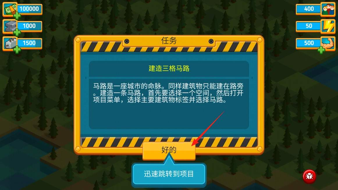 看到任务提示要求建造三格马路,我点击了“好的”确认,得先把马路建造规则记清楚——建筑物要建在路旁,然后就去找合适的空地,准备开始建马路了。