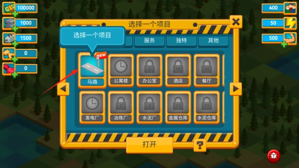 打开项目菜单,浏览各类建筑项目后选择马路,确认选择马路后点击打开,即可在之前选定的空地上建造马路,逐步搭建起城市的路网。