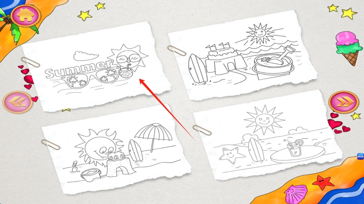 挑选心仪的夏日主题线稿,开启涂色创作之旅,用创意为图案染上独特色彩,点击即可选择图画。