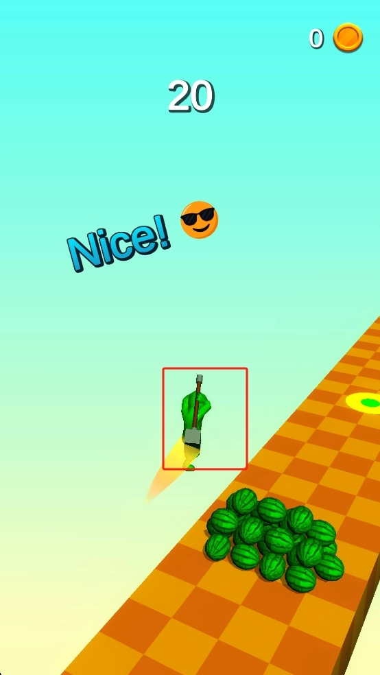 小人撞上西瓜堆后,继续进行操作,让它用斧头劈砍西瓜;当触发加速效果时,就借着这股速度快速前进,同时避开沿途的障碍,始终保持砍瓜的节奏。