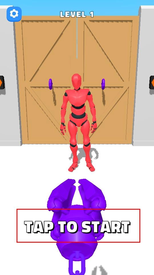进入LEVEL 1关卡界面后,红色机器人站在木门前面,点击下方紫色装置旁边的“TAP TO START”提示,即可进入射击准备状态。