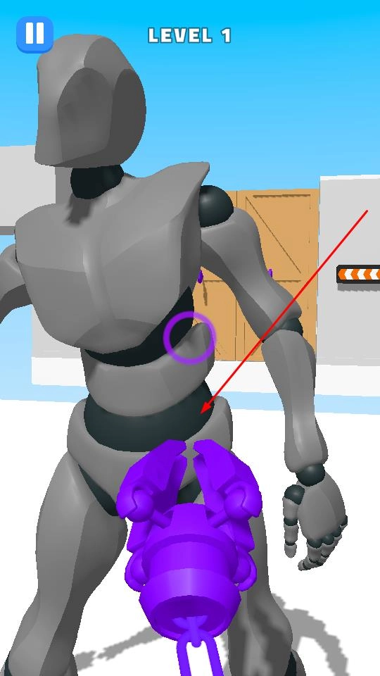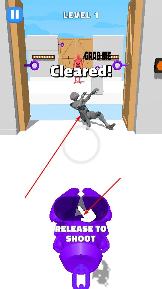 长按紫色装置后,界面会出现“RELEASE TO SHOOT”的提示,松开装置即可发射灰色人偶,对准远处的红色机器人,通过人偶的冲击力实现攻击。