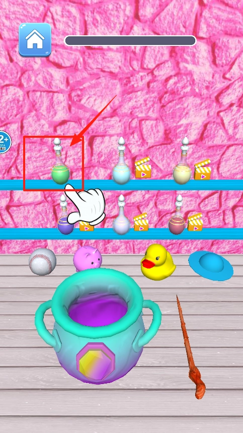 架子上那些色彩斑斓的瓶子可以拖入大锅里调配药水,不同颜色的药水相互混合会产生全新的效果。别忘了留意黄色胶片标志,只要集齐三个就能召唤出特殊魔法,让锅里的液体瞬间变成耀眼的金色呢。
