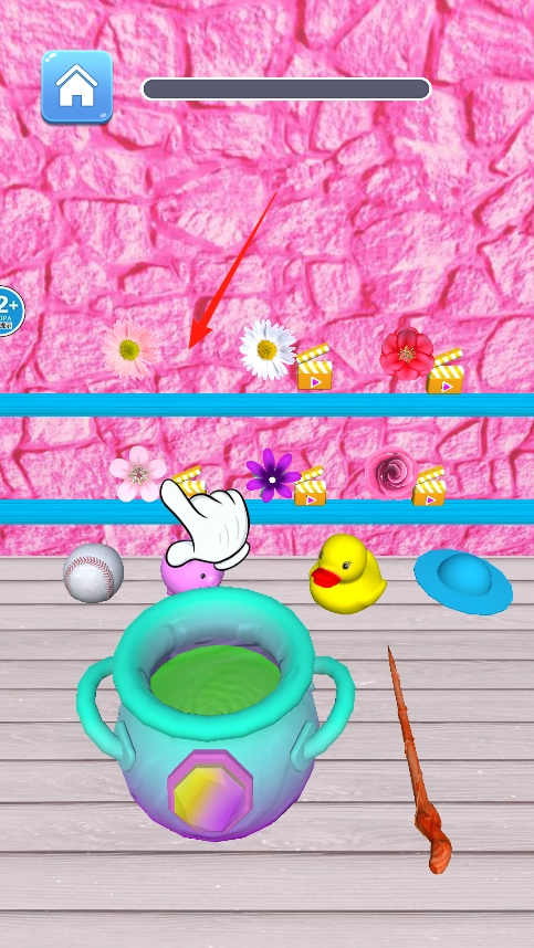 点击锅沿旁的小物品投入锅中,每放对一样东西,锅里的紫色液体就会泛起泡泡,左下角的蓝色标识会提示你可以兑换新道具了,不妨把棒球和小黄鸭一同丢进去瞧瞧效果吧。