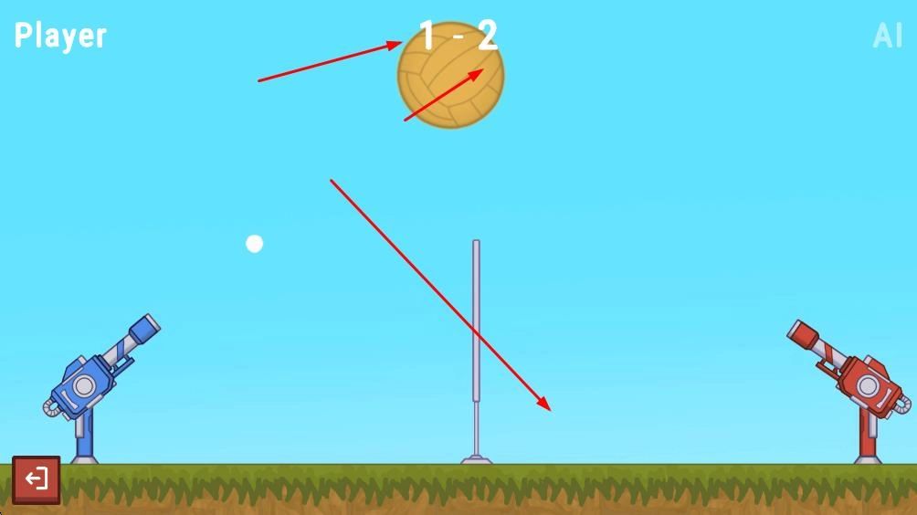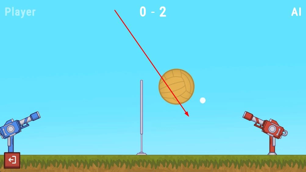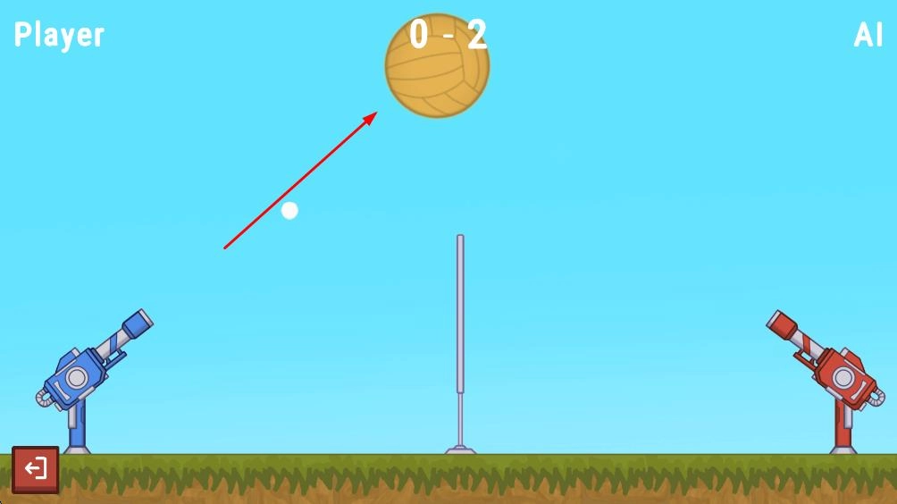 大球会朝着对方区域移动,要是大球最后落在右侧AI的红色炮台区域,我方就能得到分数,推动对战进度。