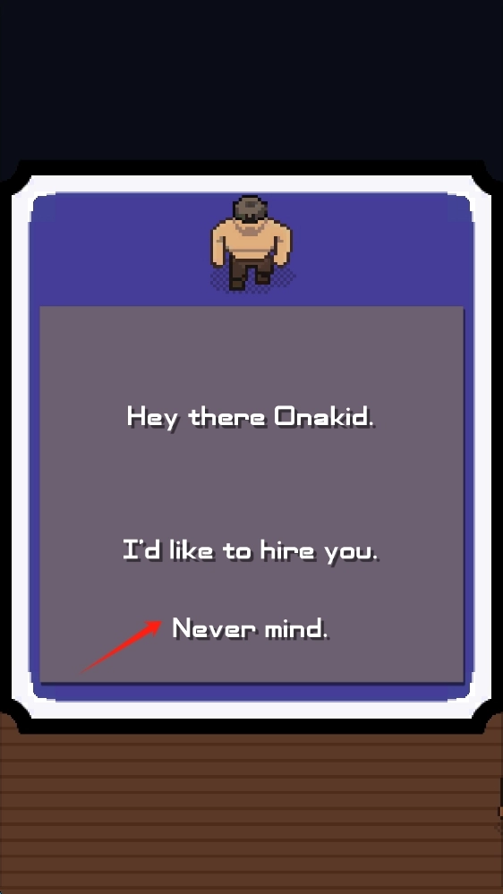 在对话界面中,点击“Never-mind”按钮以拒绝雇佣提议,随后继续探索迷宫、解锁新内容,最后点击“下一步”即可。