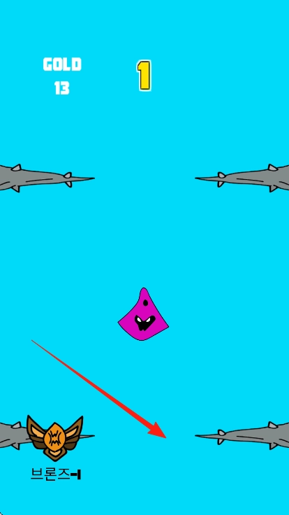 在蓝色的界面中,找准时机操控紫色角色,穿过尖刺间的空隙,收集沿途的金币,完成当前挑战后,即可进入下一阶段。
