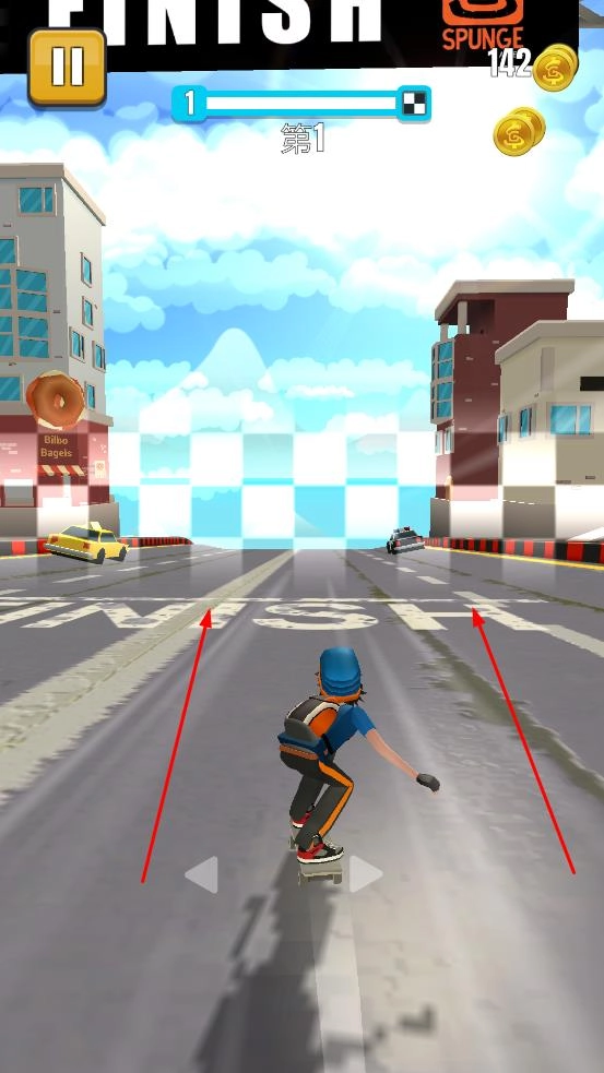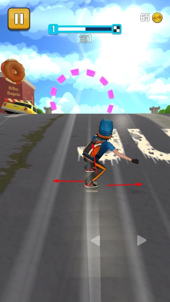 点击“开始游戏”按钮,控制滑板角色在道路上左右移动,巧妙避开各种障碍,朝着目标方向不断前进。