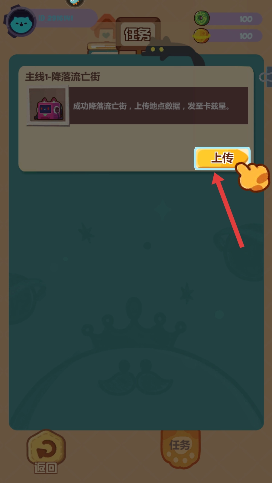 在游戏里,完成主线任务“降落流亡街”后,点击上传按钮把地点数据发送到卡兹星,这是推动剧情发展、解锁关键操作的必要步骤。