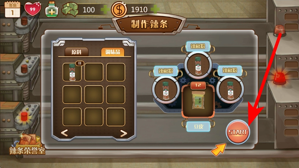 进入辣条制作环节后,在操作界面挑选所需的原料与调味品,待一切准备就绪,点击界面上的指示按钮,就能开启辣条的制作流程了。