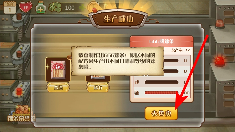 当辣条制作完成后,界面会弹出生产成功的提示,这时点击去售卖按钮,即可把做好的辣条投放到市场上进行销售。