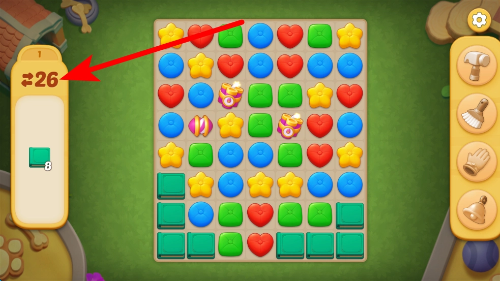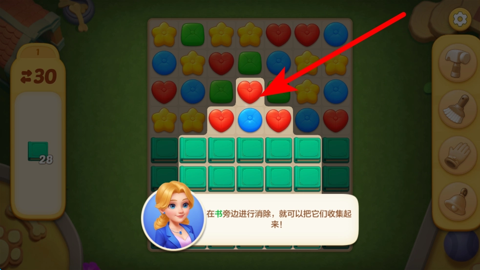 在消除关卡里,会出现消除规则的提示,像在指定位置消除能收集物品这类,按照这些提示,找出相同的元素来完成消除动作。