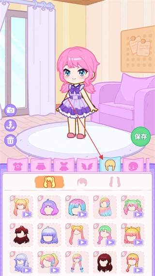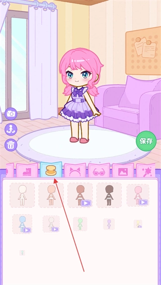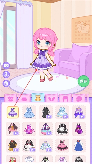 点击服装栏里的裙子图标,给角色换上紫色连衣裙。