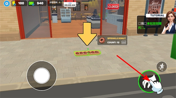 点击拾取按钮来收集面包和甜点,收集甜点是开展经营活动的关键步骤,收集完成后可以把面包甜点摆放在店内进行售卖,以此积累经营所获得的收益。
