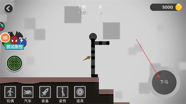进入关卡后,使用左下角的道具进行布置来攻击火柴人,点击右下角的“下马”按钮即可开始游戏。