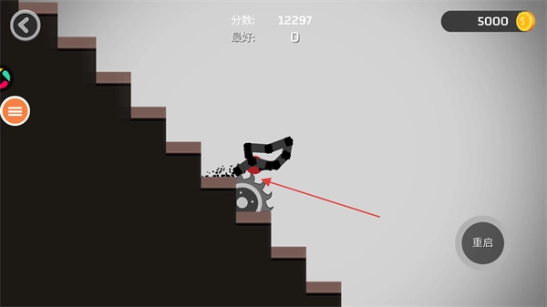 可以借助楼梯间里的各类设施让火柴人受伤来增加得分,要是觉得结果不理想,点击重启按钮就能重新玩游戏。