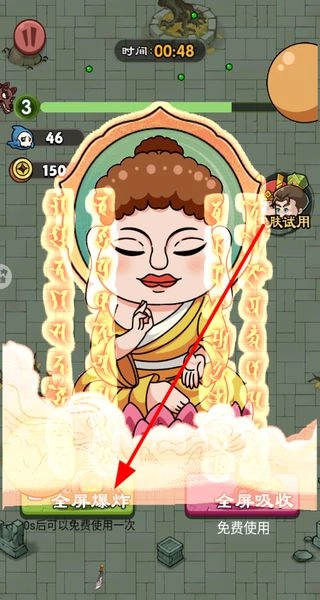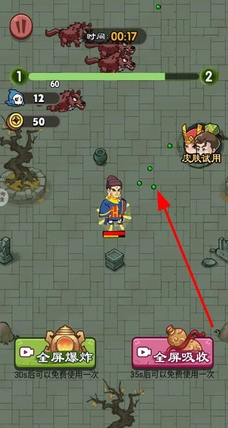 在战斗过程中释放全屏爆炸技能,清除该范围内的怪物,以此获取资源与分数,从而提高游戏的通关效率。